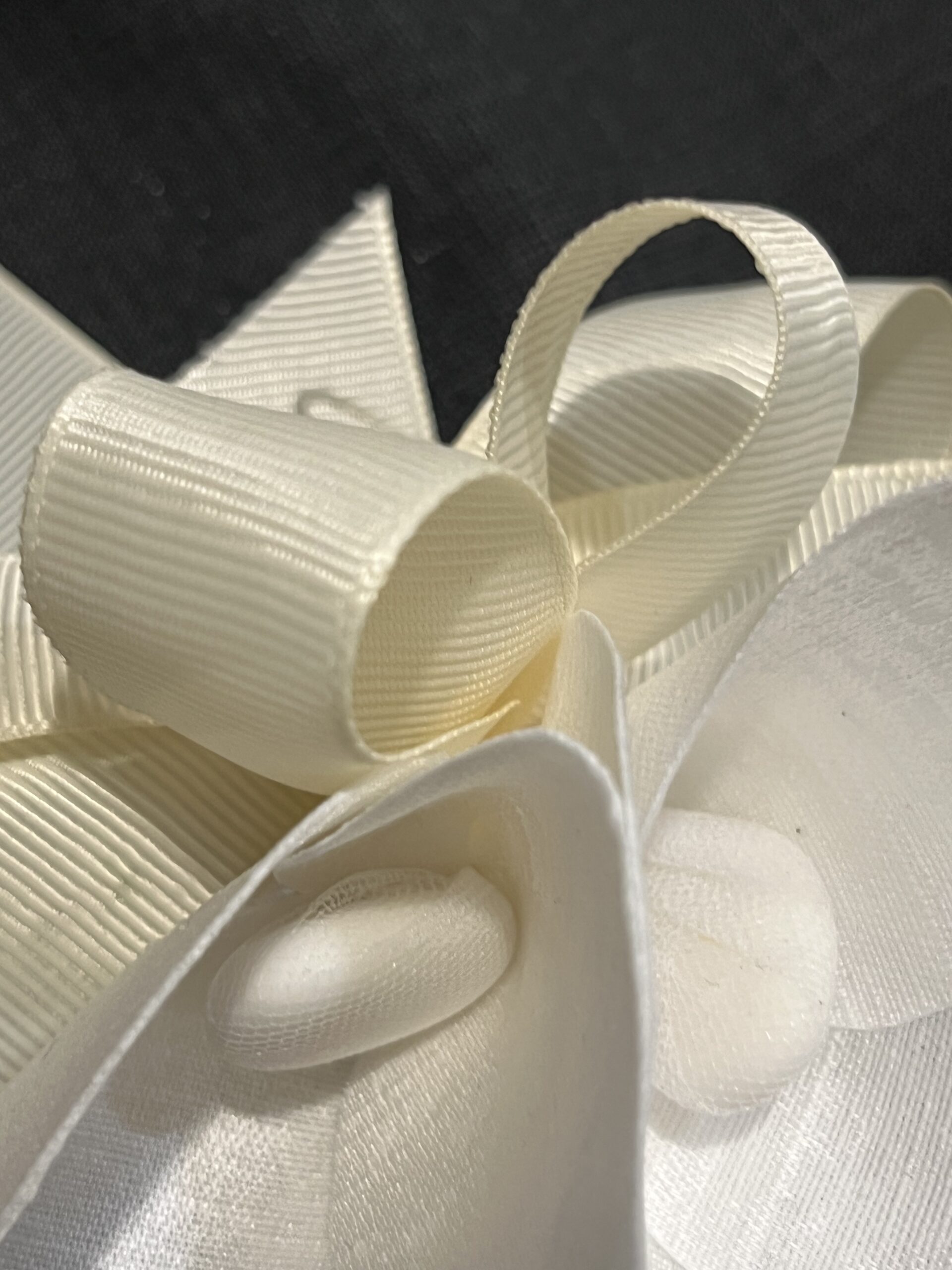 Boccioli in tessuto con confetti e nastro écru in gros grain.