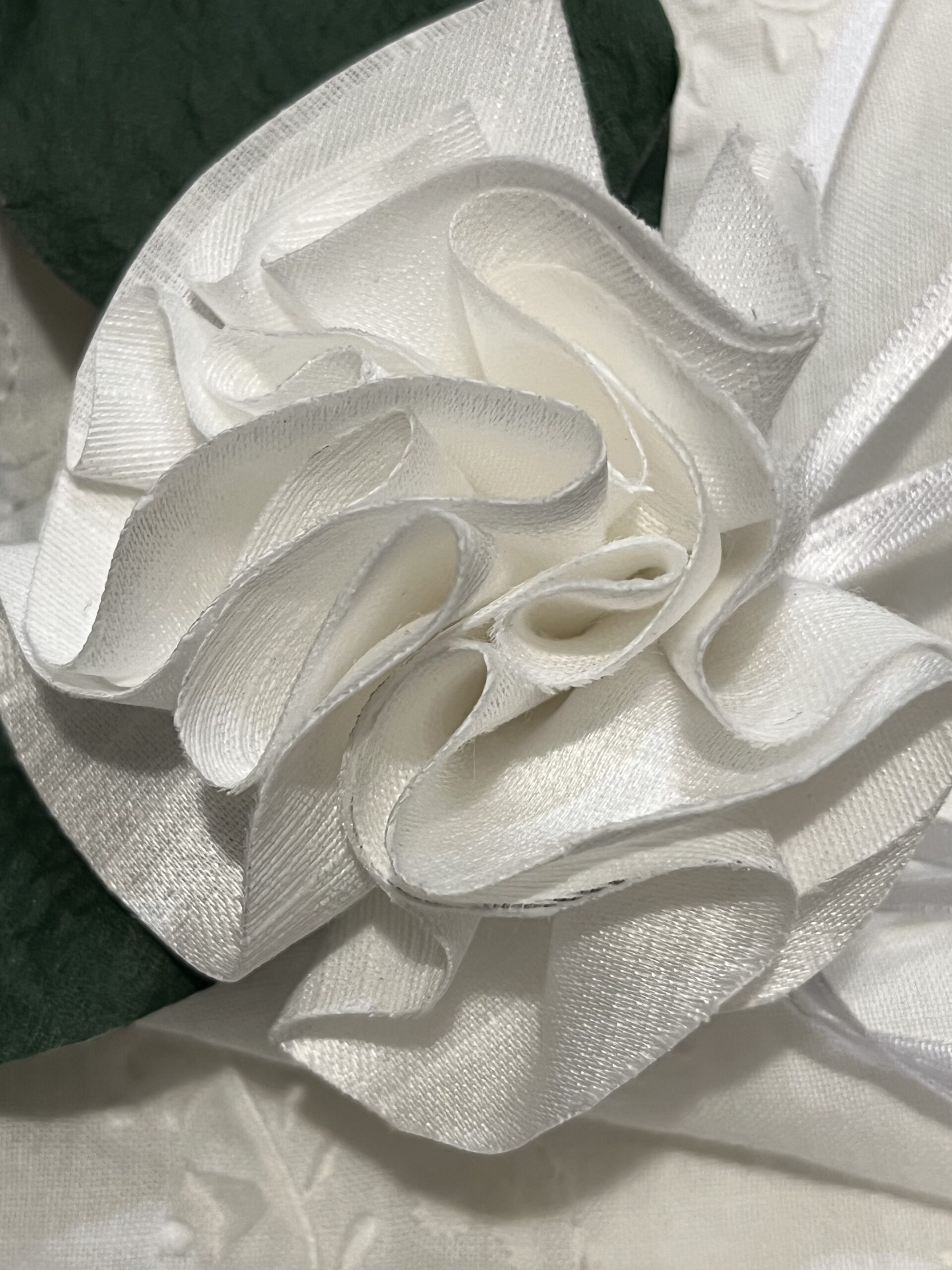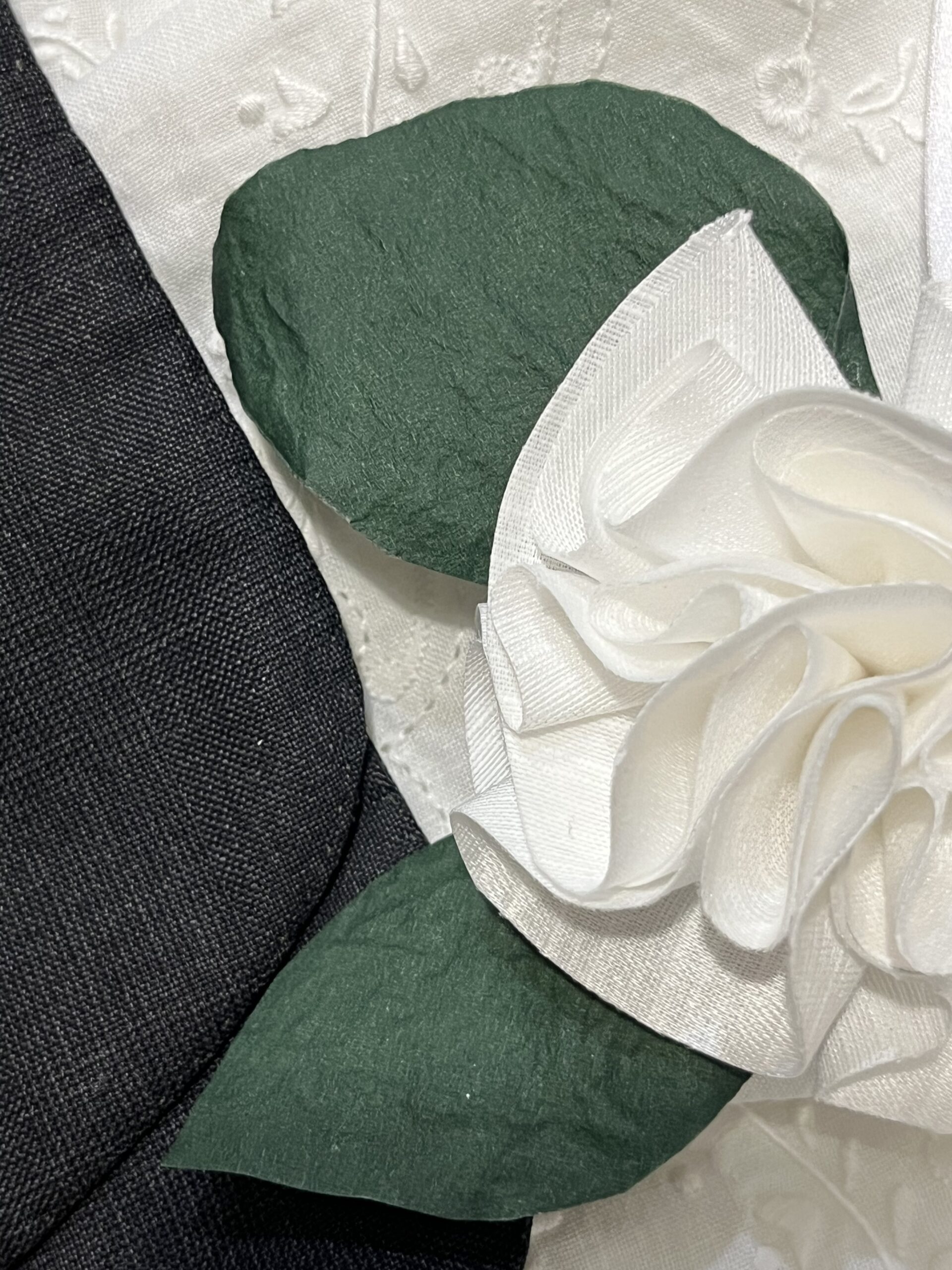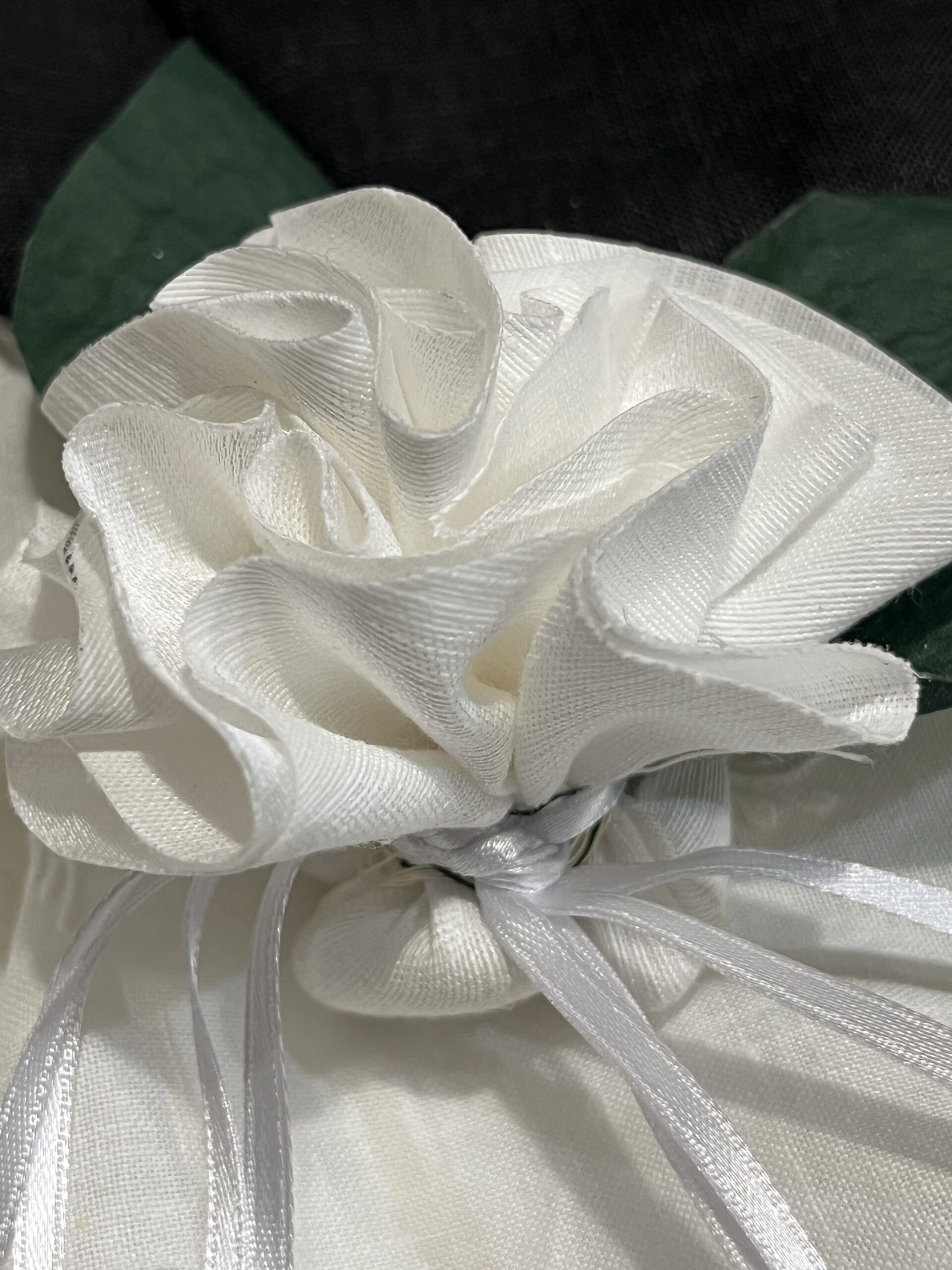 Ciuffo con confetti, nastro in doppio raso e foglie di carta lavorate a mano.