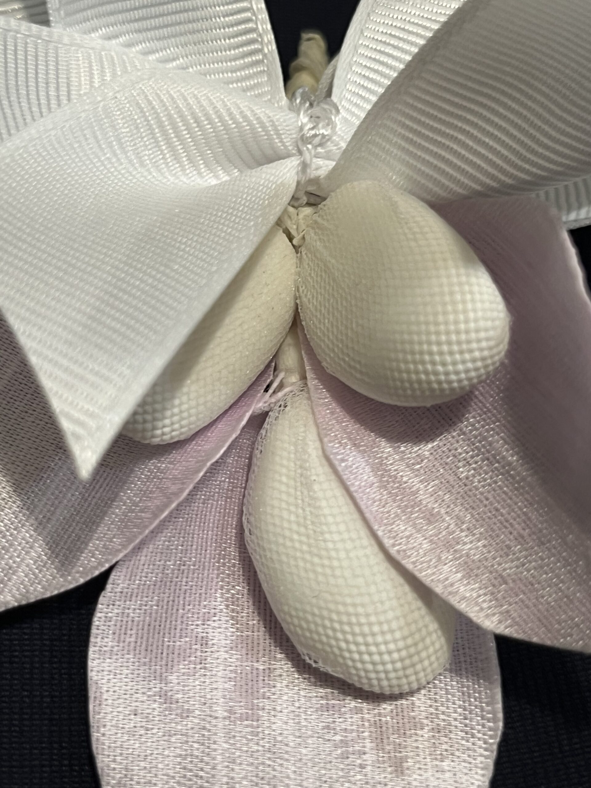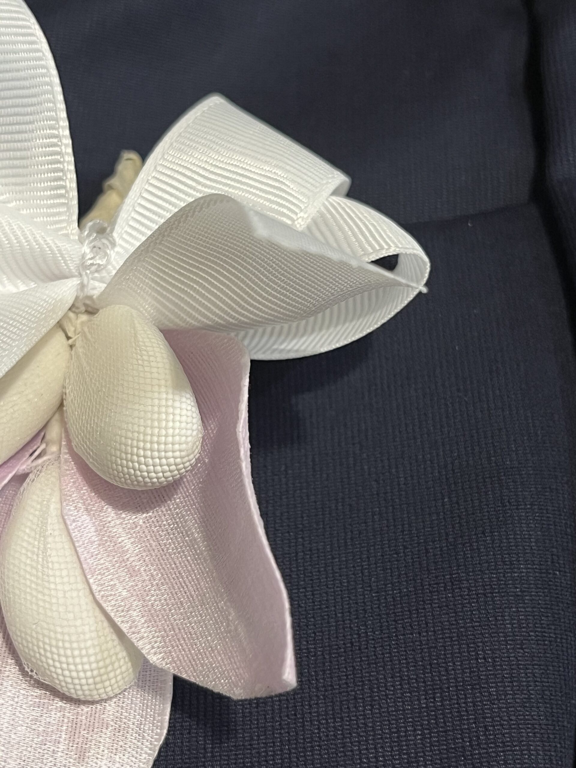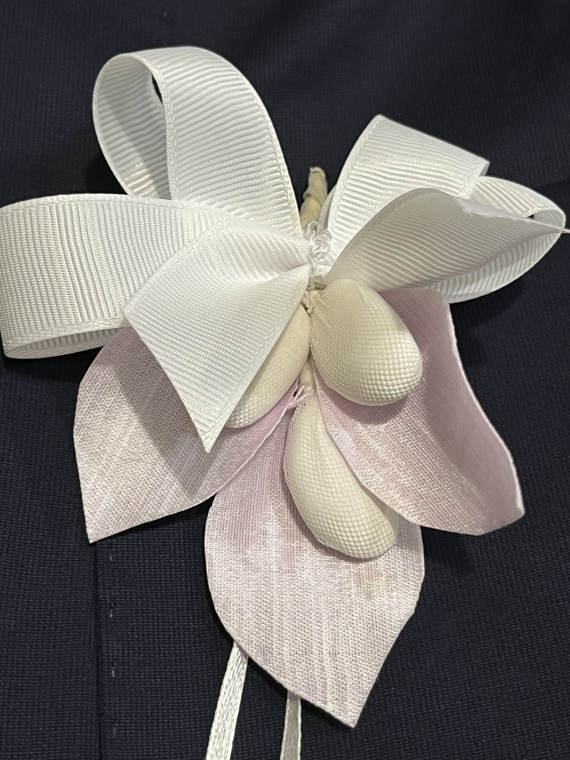 Grappolo di 3 confetti su foglie di tessuto con nastro in gros grain.